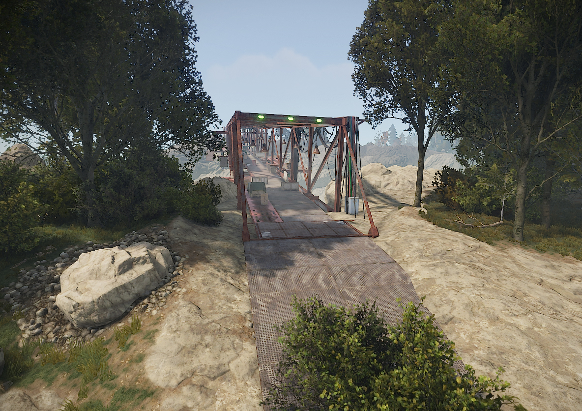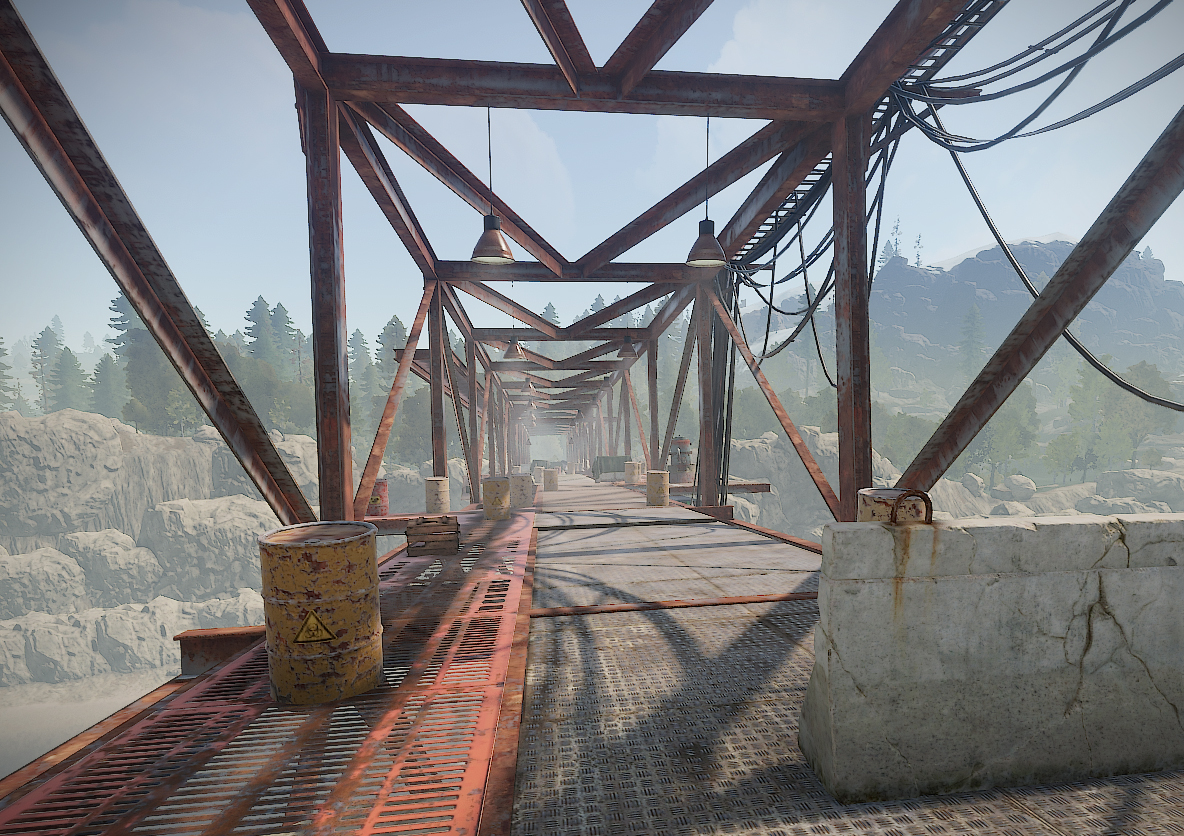 На мосту распологаются бочки, ящики и НПЗ. Перед мостом стоит небольшая куча с ресурсами в виде металлической руды, за мостом контейнер с переработчиком и парой ящиков.