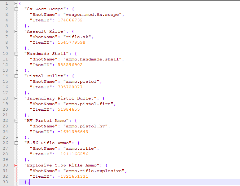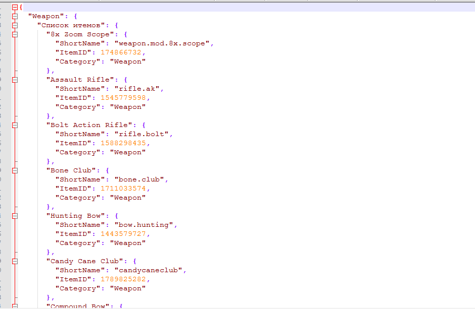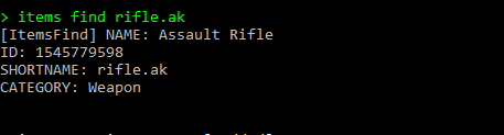 items save - Что бы сохранить все предметы в один файл в data/ItemsFind/AllItemsList items save category - Что бы сохранить все предметы по файлам с названиями категорий items find 'shortname/id/name' - Что бы найти информацию об определенном итеме или по ключу