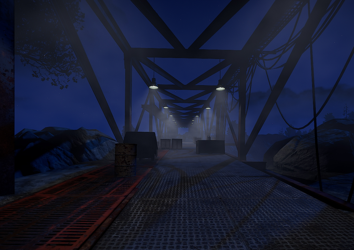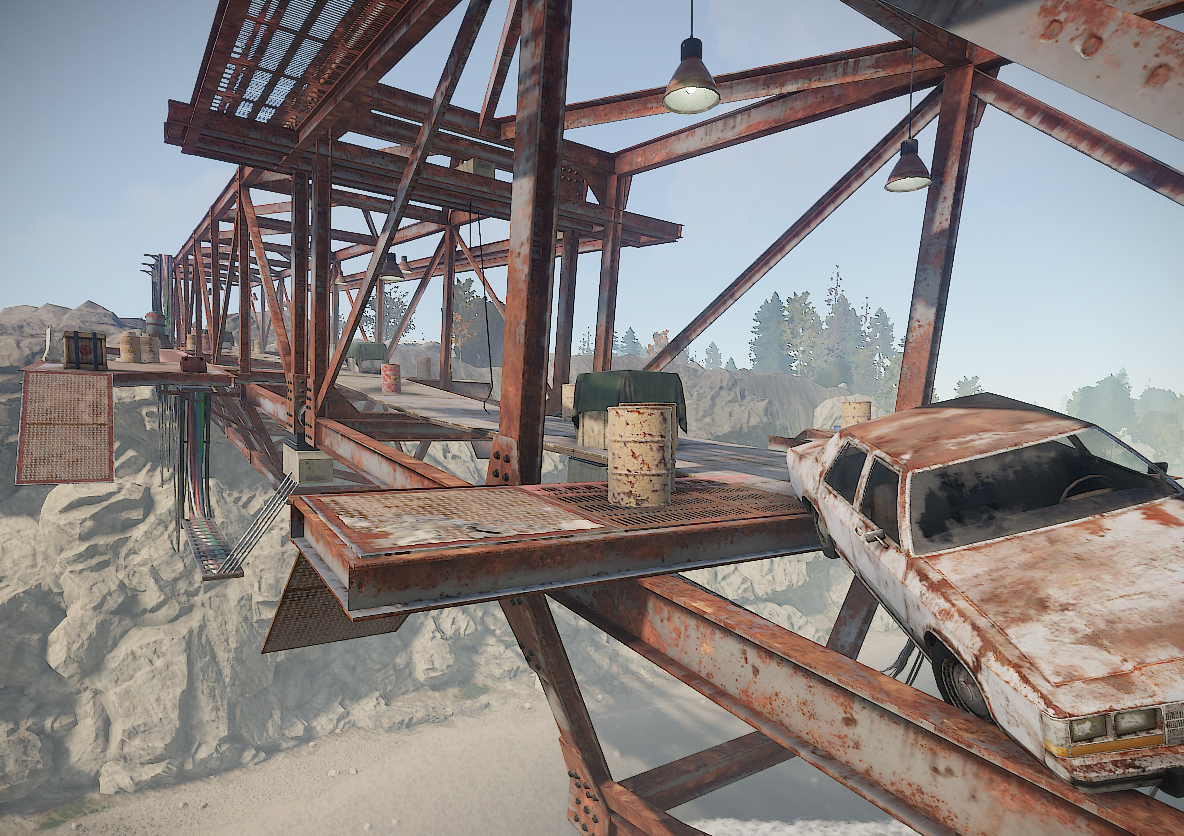 На мосту распологаются бочки, ящики и НПЗ. Перед мостом стоит небольшая куча с ресурсами в виде металлической руды, за мостом контейнер с переработчиком и парой ящиков.