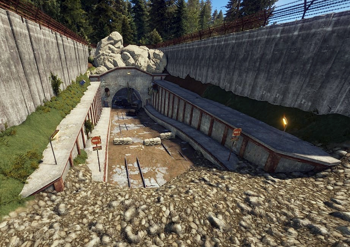 Справа от входа располагается заваленный туннель, слева в углу будка с первой зеленой дверью. Всего дверей 3 (+синяя и красная).
