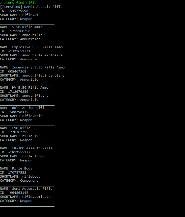 items save - Что бы сохранить все предметы в один файл в data/ItemsFind/AllItemsList items save category - Что бы сохранить все предметы по файлам с названиями категорий items find 'shortname/id/name' - Что бы найти информацию об определенном итеме или по ключу