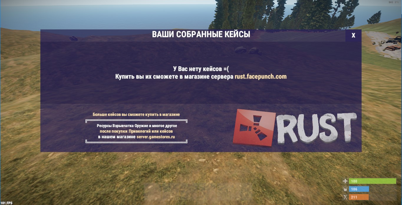 "nogiveCases": "У Вас нету кейсов =(\nКупить вы их сможете в магазине сервера <color=#fee3b4>rust.facepunch.com</color>",