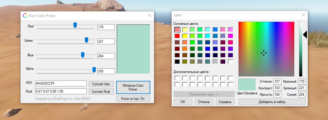 Данная программа позволяет преобразовать любой цвет из формата HEX в HEX RGBA и Unity RGBA, которые могут восприниматься системой Community User Interface (CUI) в Rust